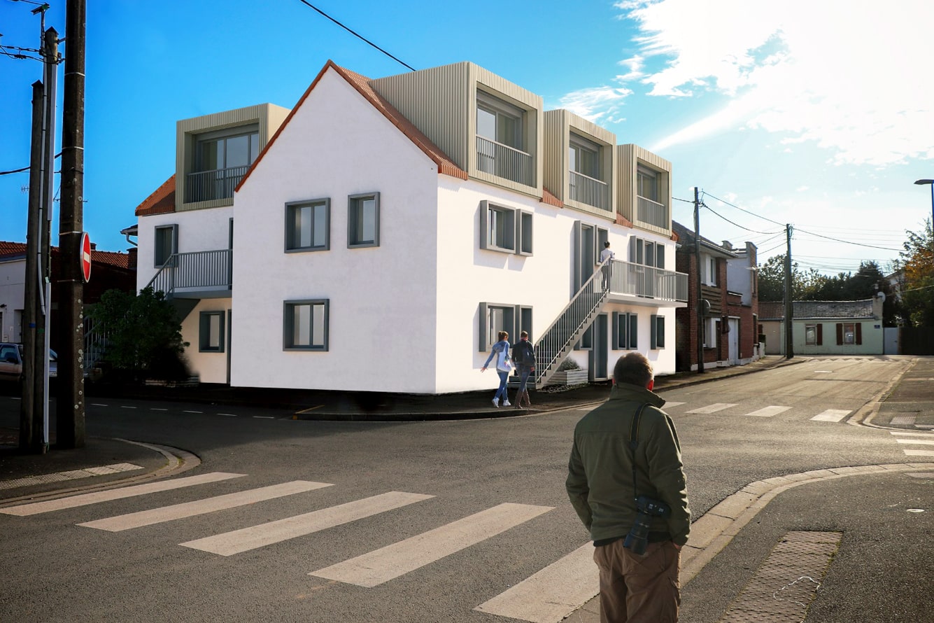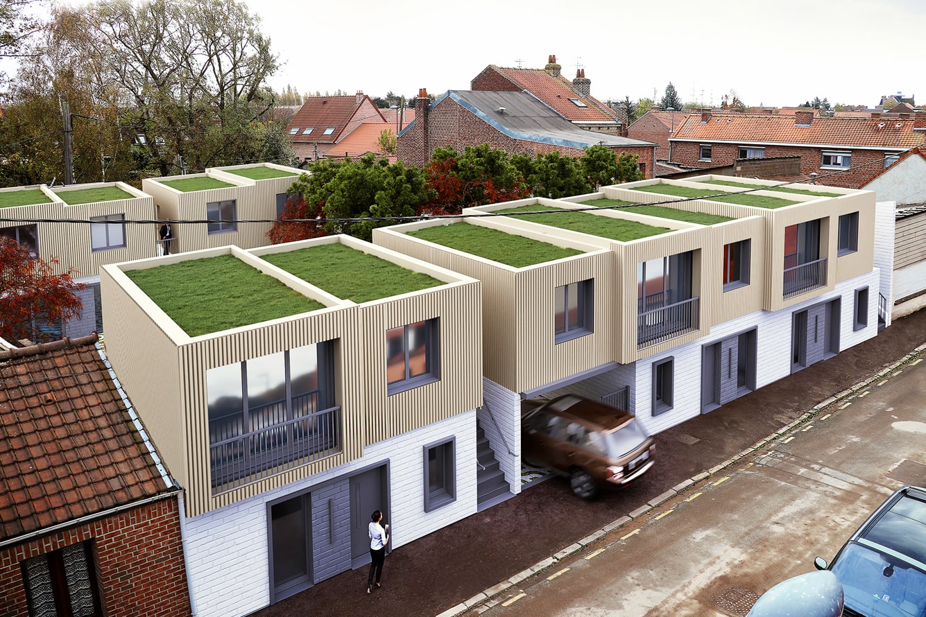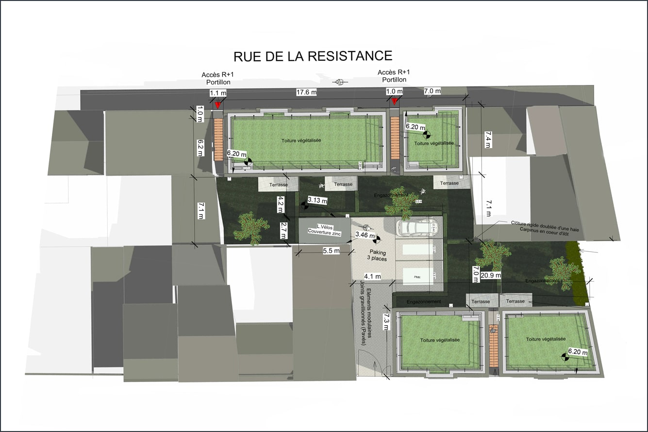 Le projet neuf est conçu en 2 bâtis distincts, le 1er à l’alignement de la rue de la Résistance et le second rue du Soleil Levant. Cette implantation permet la création d'un coeur d'îlot végétalisé et arboré qui lie les 2 bandes bâties et qui permet à chaque logement de bénéficier d'un extérieur planté calme et privatif. Les bâtis en R+1 sont caractérisés par des volumes à l’étage en sailli. Ce projet fait écho aux 2 opérations de réhabilitation/restructuration situés sur des parcelles proches qui sont conçus en rajoutant des volumes en aplomb à la suite de la surélévation de leurs toitures existantes.