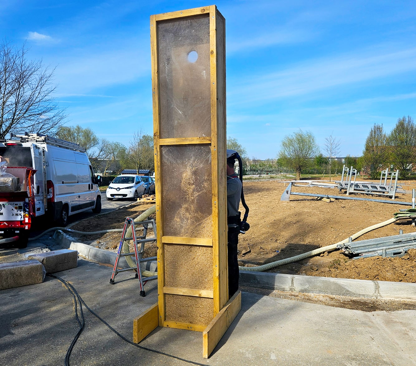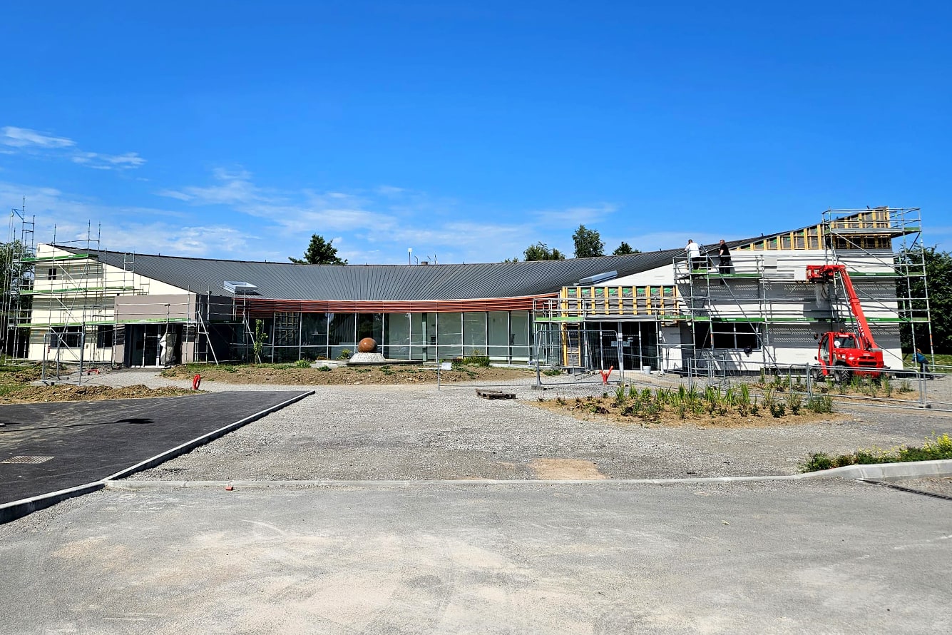Le bâtiment avec son enveloppe en béton fait l’objet d’une réhabilitation énergétique (hors locaux process) incluant le changement du mur rideau qui marque l’arrondi si significatif de sa façade d’entrée. La réhabilitation thermique sera mise en place à travers un procédé de panneaux préfabriqués en ossature en Bois et une isolation en Paille. Un Habillage extérieur des façades sera traité avec un enduit mince afin respecter l’esthétique du bâtiment existant et d’en conserver l’image si expressive de son architecture. A la suite du remplacement du mur rideau, des brises soleil d'une teinte rouge orangé seront posés afin d’améliorer le confort intérieur lié au rayonnement direct du Soleil.