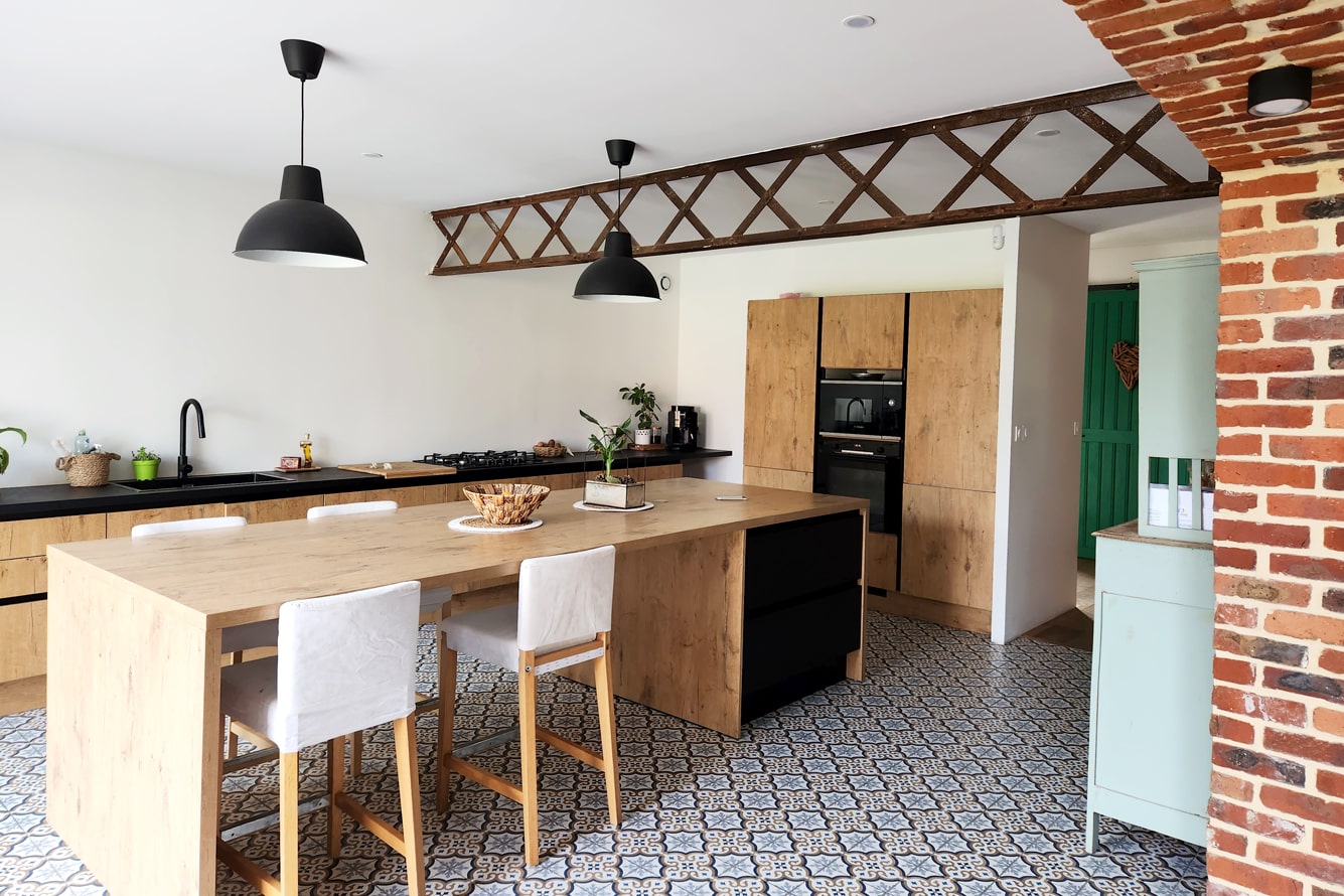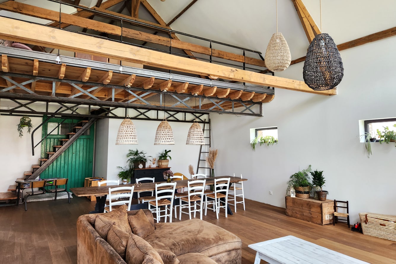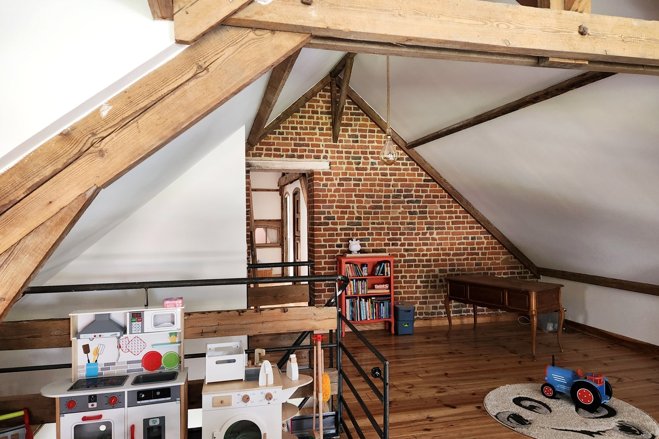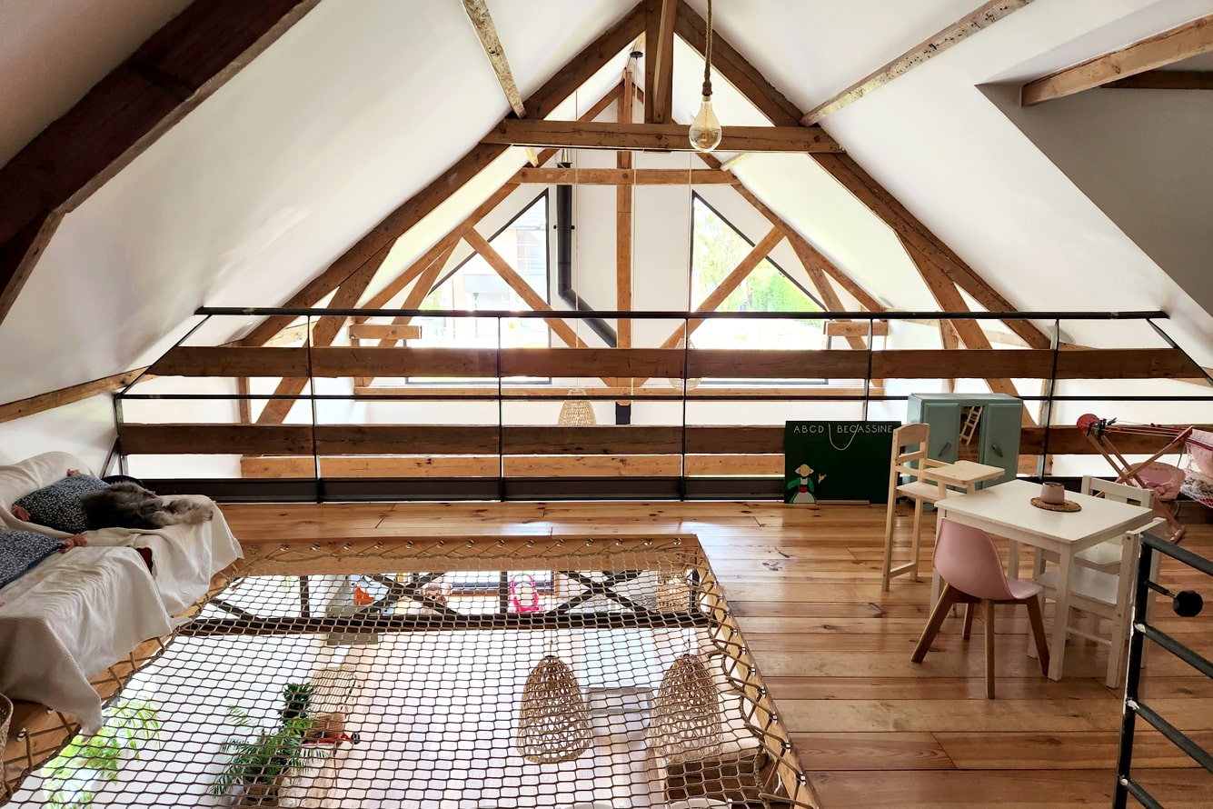 Les intérieurs sont complètement remodelés et aménagés, donnant lieu à des espaces lumineux et contemporains. La double hauteur de la pièce de vie, la mezzanine comme espace de jeux et les poutres apparentes de la cuisine ouverte donnent à chaque espace une architecture unique !