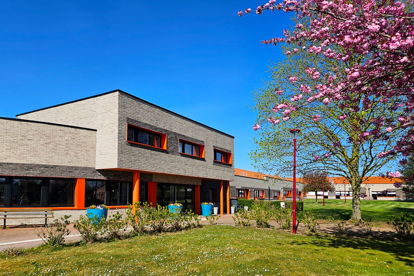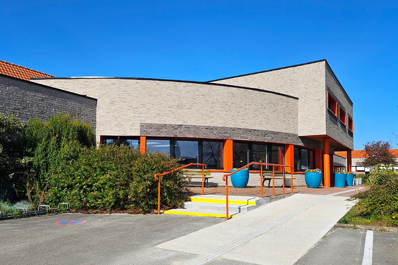 Les façades existantes sont requestionnées via la mise en oeuvre d’une brique moulée main qui accroche la lumière. L’ensemble des acrotères des façades est réhaussé en raison de la mise en oeuvre des unités extérieurs des nouvelles pompes à chaleur. Le linéaire important des façades est déstructuré par la pose de deux briques différentes alliée aux jeux de niveaux lié à la topographie du site.