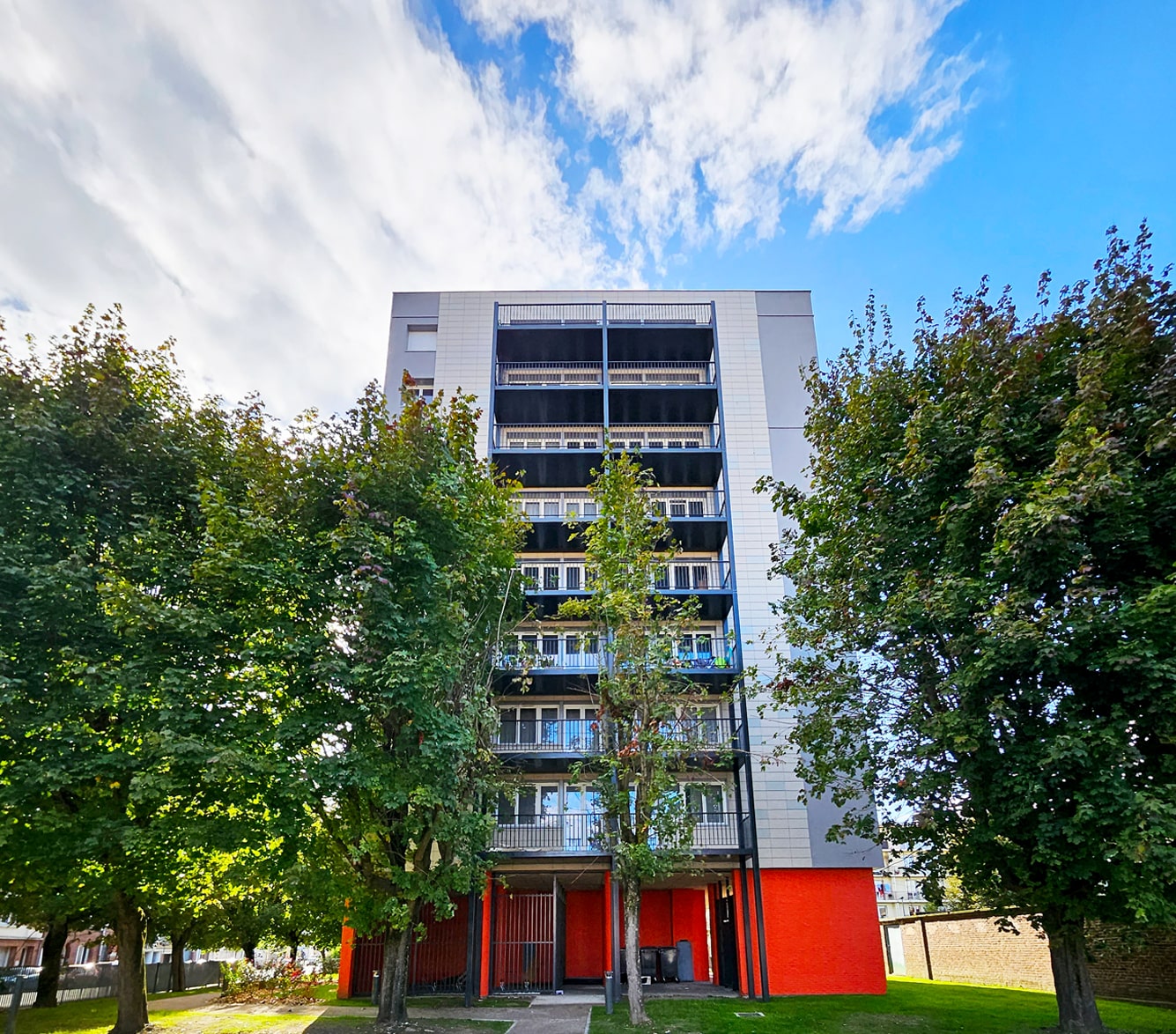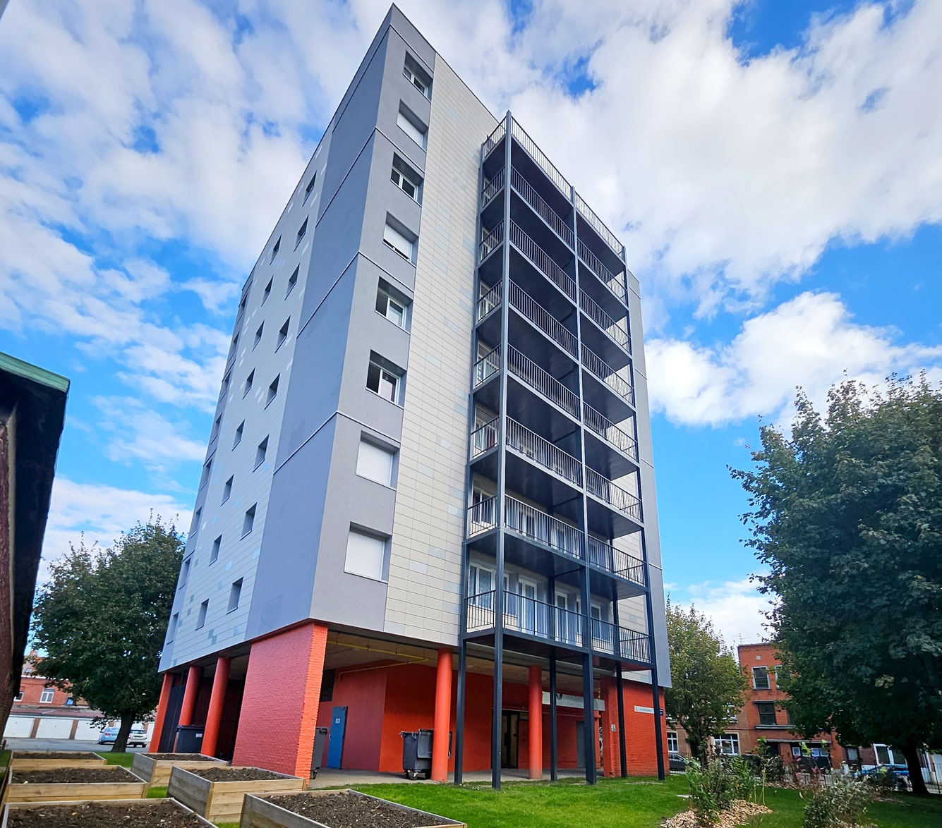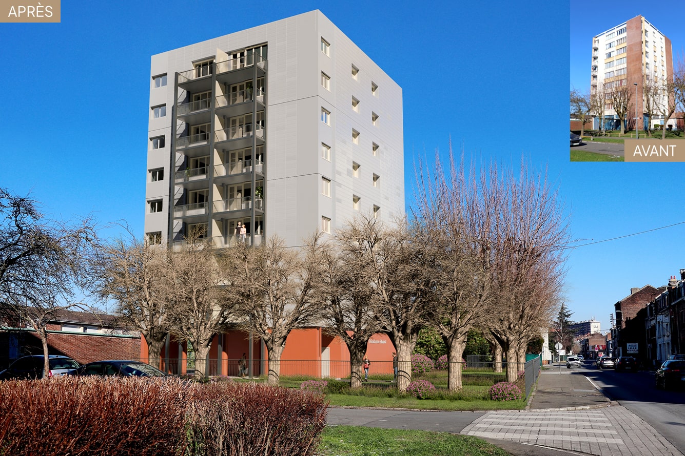 Des nouveaux balcons en structure autoportée métallique sont conçus sur 2 des façades de la tour en prolongement des espaces de vie des logements. Le projet inclus la démolition des dépendances et la restructuration du RDC en réorientant l’entrée vers la rue principale : rue d’Emmerin.