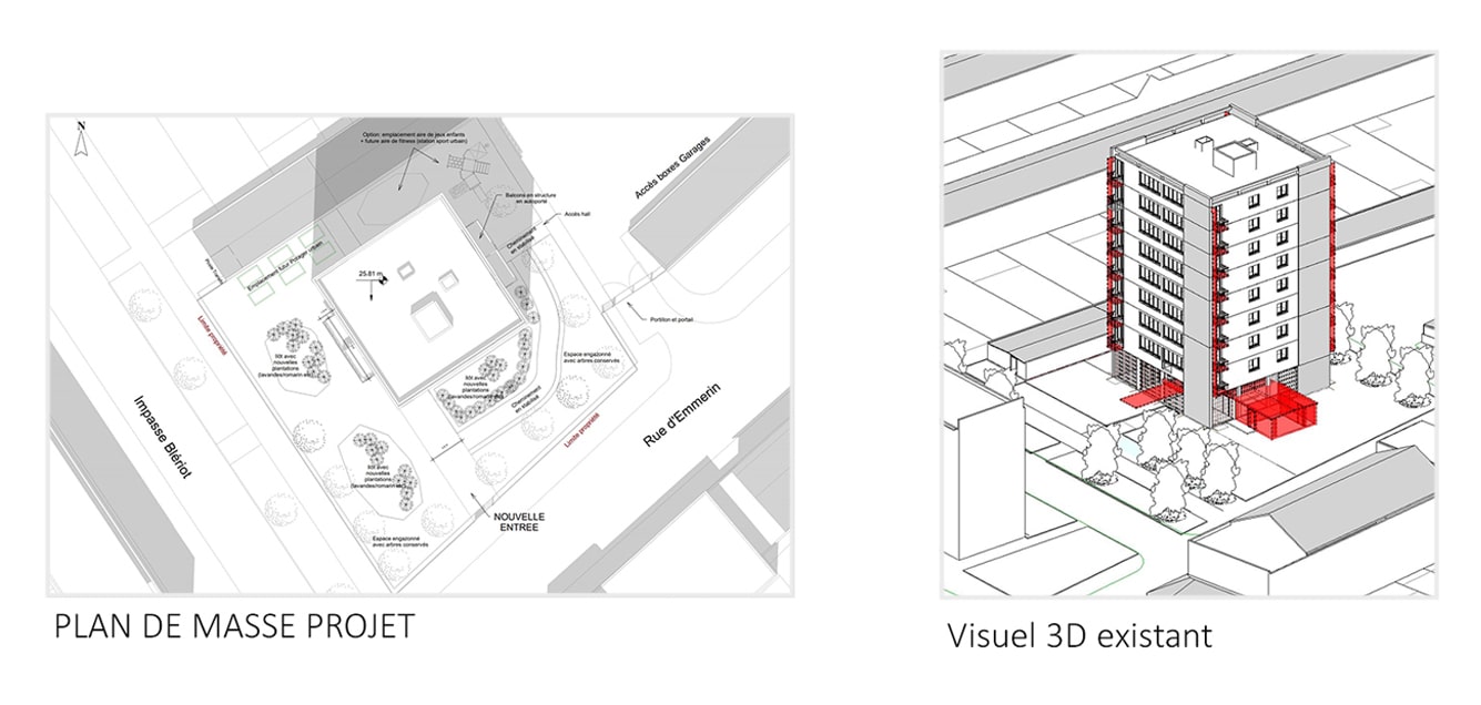 La résidentialisation comprend la végétalisation des abords, la création de cheminements vers la nouvelle entrée, les boxes de stationnement et la création de locaux vélos en RDC.