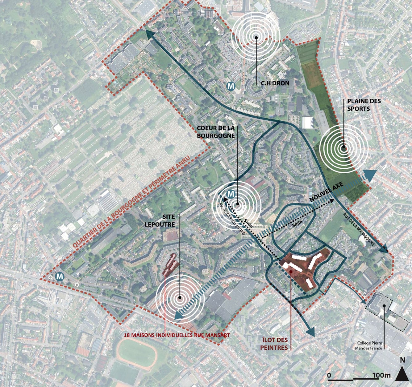 Située au nord de la Ville de Tourcoing, la résidence Bocage 1 fait partie du quartier de la Bourgogne. Ce quartier qui date des années 1960 comprend une grande variété typologique et sociale avec une forte identité. L’architecte du projet, Jean Willerval, a proposé à l’époque une nouvelle lecture des maisons individuelles que le projet de réhabilitation valorise et amplifie. Les espaces extérieurs privatifs prennent tout leur sens que ça soit pour les jardins arrière ou les séquences d’entrée.