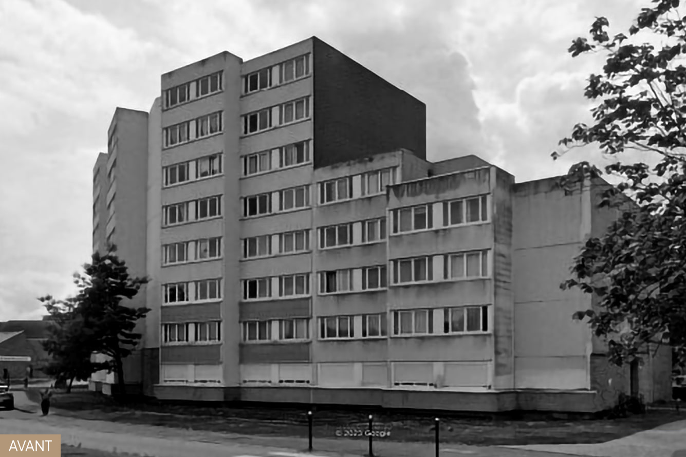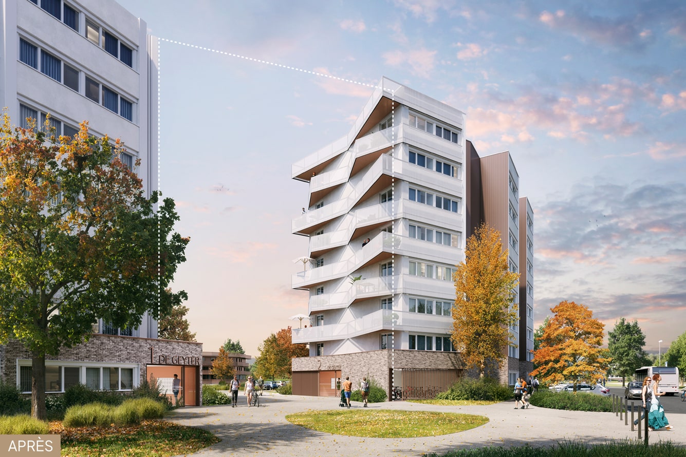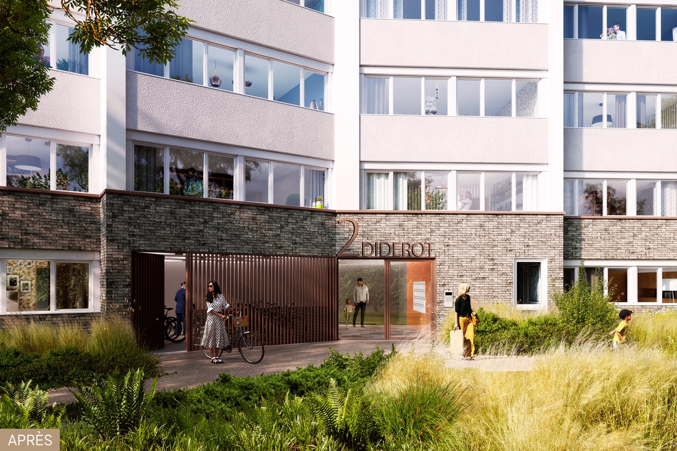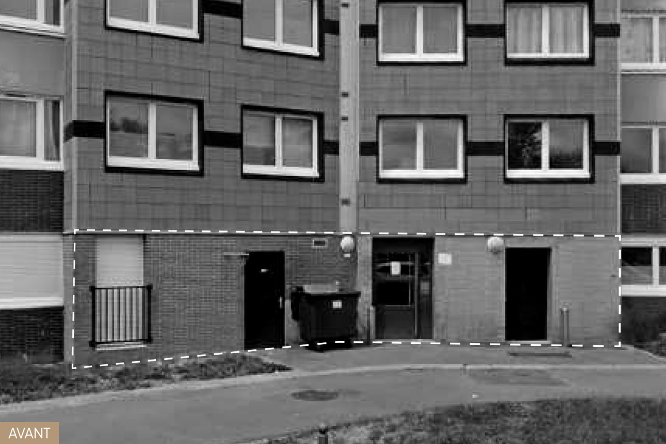 Le projet de façade permet de souligner l’écriture originelle des bandeaux à la suite de la mise en oeuvre de l’ITE (mixte bardage métallique et enduit blanc). En RDC, il exploite le potentiel des halls d’entrée afin de retrouver une unité architecturale par un socle de briques.