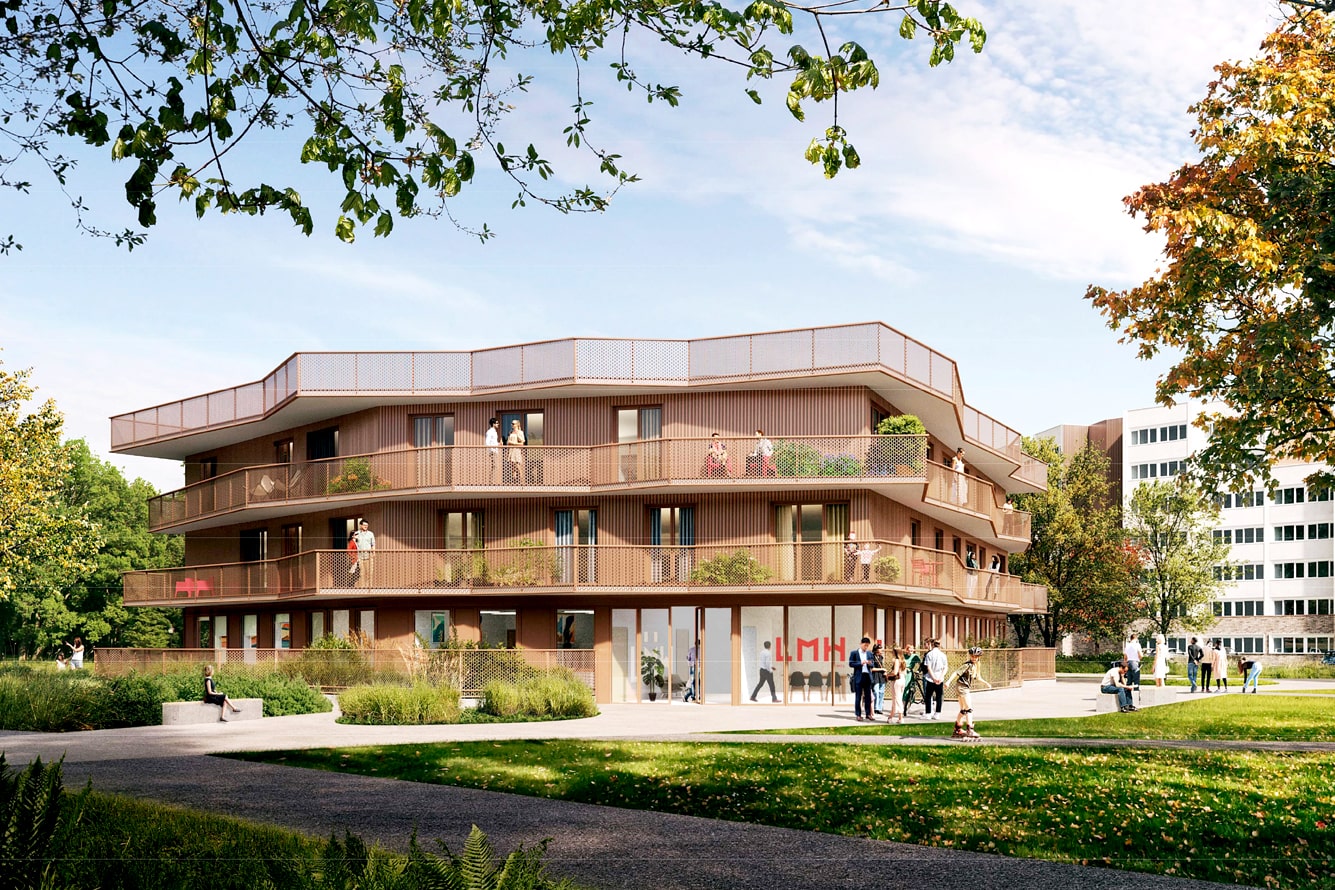 Au coeur du parc, il est conçu un nouvel immeuble avec une offre de logements séniors qui surplombent un socle transparent où se localisera l’agence LMH.